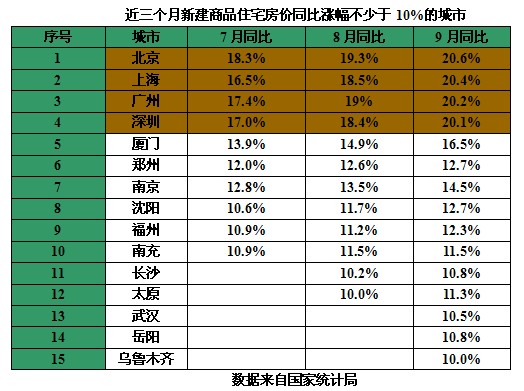 数据显示,9月份房价同比涨幅超过10%的城市已经达到14个,除了一线城市,还有厦门、郑州、南京、沈阳、福州等10城市。经梳理发现,自7月份以来,已经连续三个月有至少10个城市房价同比超10%。对此,中原地产市场研究部总监张大伟分析:“一、二线城市‘日光盘’频出,而且各地用精装修拆分等额外的购房支出也在增加。实际价格上涨幅度超过指数体现的涨幅。目前这些城市房价即使不涨了,年底的指数涨幅也将超过10%。”