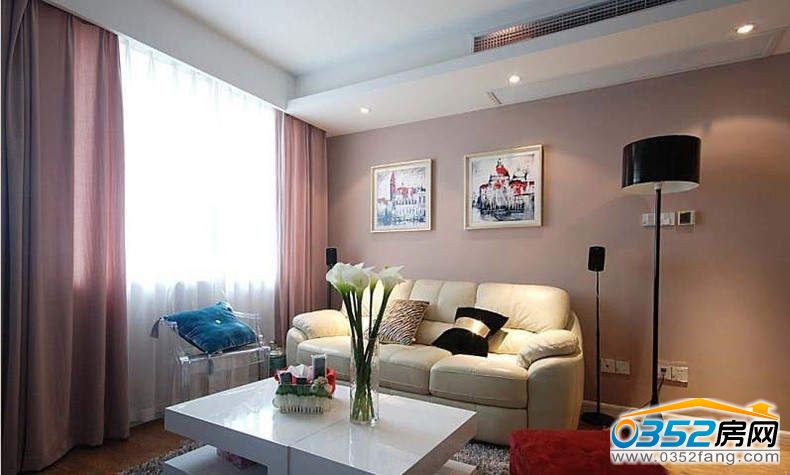 客厅比较小,我选择了小户型的米色沙发,粉粉的窗帘是我的最爱,没有用吊灯,在沙发边放了落地灯,平素看书看电视还是挺好的。