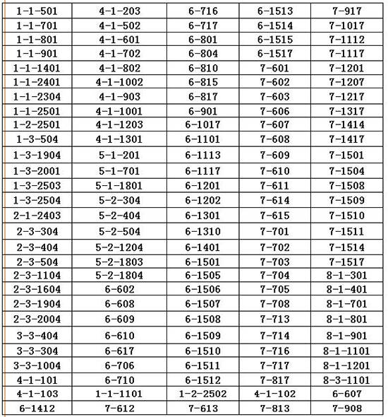 东7-1-1102 东7-2-501 东7-2-601 东7-2-701 东7-2-901 东7-2-1001 东7-2-1301东7-2-1401 东7-2-1501东7-2-1002 东7-2-1102 东7-2-1202 东7-2-1502 东7-2-1702西1-1-601 西-1-801 西1-1-901 西1-1-1101 西1-1-1201 西1-1-1301 西1-1-1501西1-1-1601 西1-1-1701西1-1-602 西1-1-702 西1-1-802 西1-1-1502 西1-1702