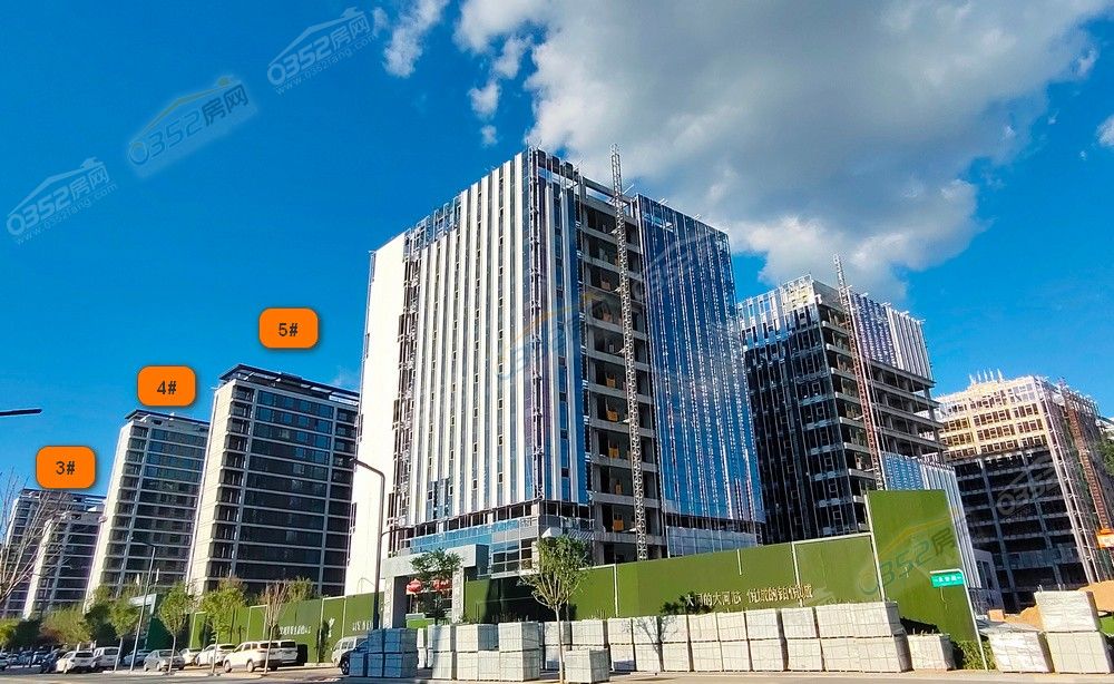 工程进度:西侧楼栋进行外立面建设和玻璃安装,东侧小高层有序建设中。