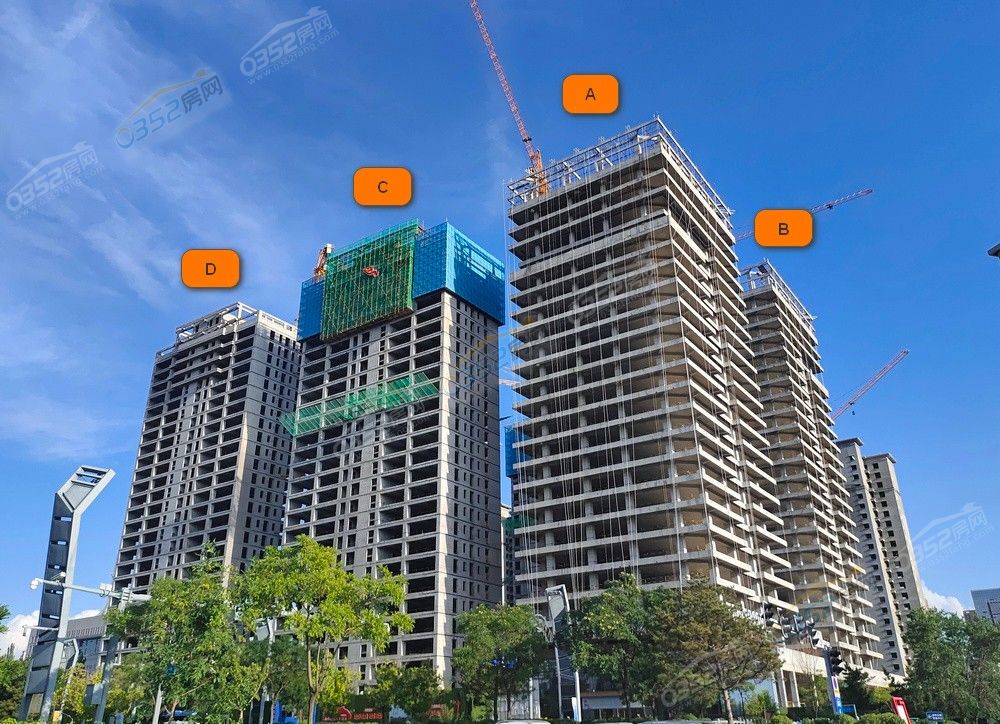 工程进度:部分楼栋外立面建设完成,西侧大门建设完成,园林景观同步建设。