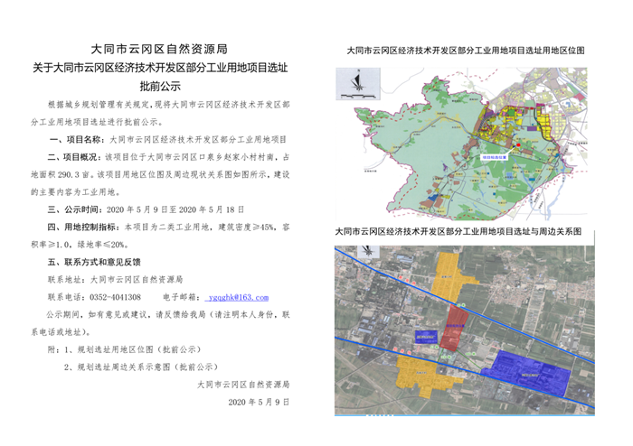 根据城乡规划管理有关规定,现将大同市云冈区经济技术开发区部分工业用地项目选址进行批前公示。