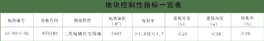 规划确定LC-09-C-02地块用地性质为二类城镇住宅用地(070102),用地面积为5897平方米,依据规划用地性质赋予地块相应控制性指标。
