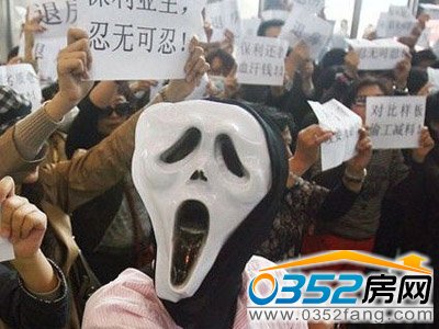 时隔两天,房展会现场又来了一批维权的业主,这次他们所戴的面具换成了电影《让子弹飞》中的麻匪形象,有戴“二饼”的,有戴“五饼”的,喜感十足。这批业主带来的横幅上写着“××:让欺诈再飞一会儿”,他们认为,开发商涉嫌欺诈销售、虚假宣传,而且楼盘的品质低劣,因此坚决要求退房。不过,开发商在现场也没有做出任何回应。#p#副标题#e#