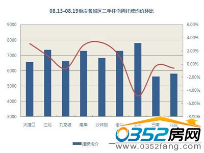 搜房网二手房数据监控中心数据显示,上周(08.06-08.12)重庆主城二手住宅挂牌均价为7028元/平米,与前一周7043元/平米均价相比,环比下跌15元/平米,跌幅为0.21%。继8月第一周重庆二手房挂牌均价上涨后,8月第二周小幅下跌。