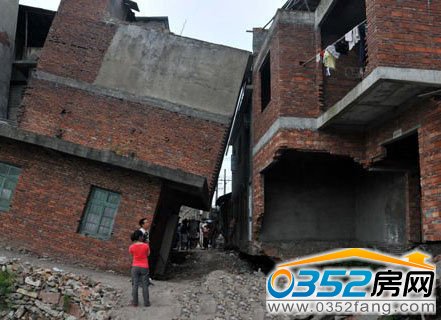 这是未建拢大坝的另一段--西瓜洲段一座倾斜了近45度角的居民楼,2010年7月份昌江洪水来时被冲坏的房屋。