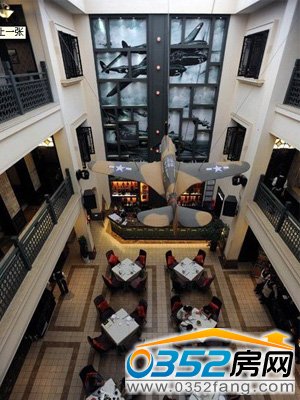 餐厅内以上世纪40年代的室内装饰为风格,吊顶上悬挂一个飞虎队战斗机模型,餐厅内服务员统一穿着当年的军装制服上菜。