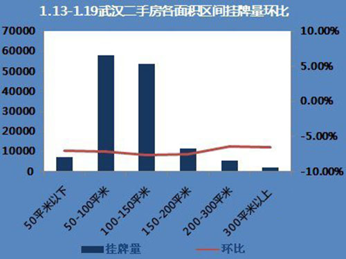 武汉二手房数据监控中心数据显示,2014年1月13日-2014年1月19日,武汉二手房住宅各面积区间的挂牌量均有所下跌。其中跌幅最大的是100-150平米的房源,环比下跌7.59%;其次为150-200平米的房源,环比下跌7.17%。