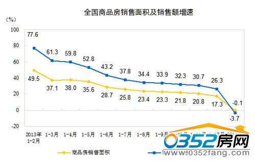 2月末,商品房待售面积51397万平方米,比去年末增加2102万平方米。其中,住宅待售面积增加1770万平方米,办公楼待售面积增加64万平方米,商业营业用房待售面积增加233万平方米。