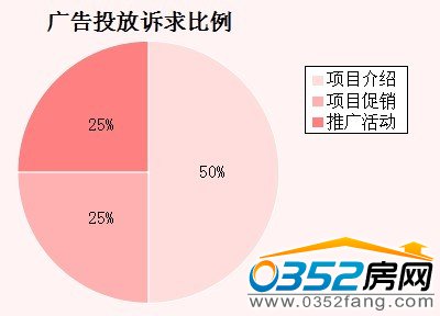 广告中,诉求点是关键内容,在此次统计中,有半数的楼盘投放信息是相关的项目介绍,其次是品牌推广和项目促销,各占25%。