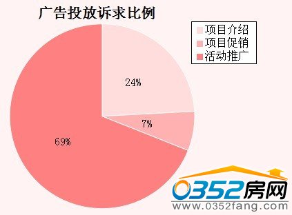 广告中,诉求点是关键内容,在此次统计中,大多数以推广活动出现,其次是开发公司项目介绍,而其中项目销售优惠促销占少部分,这也和项目具体的销售节点有关。