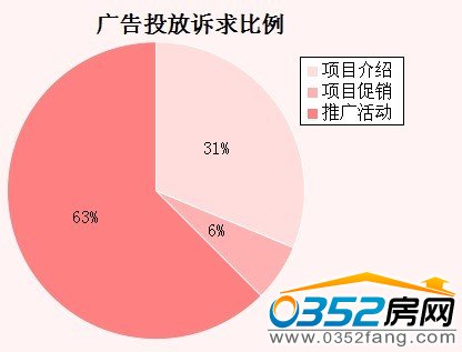 广告中,诉求点是关键内容,在此次统计中,有半数多的楼盘投放信息是相关的推广活动,其次是开发公司项目介绍,而其中项目销售促销及优惠活动占少部分,这也和项目具体的销售节点有关。