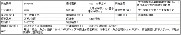 六、 本次国有土地使用权挂牌活动 在 太原市国土资源交易事务中心(太原市金刚堰路2号太原国土大楼一层) 进行。各地块挂牌时间分别为:SG-1404 号地块:2014年04月08日08时00分 至 2014年04月22日10时00分 ;