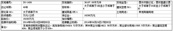 六、 本次国有土地使用权挂牌活动 在 太原市国土资源交易事务中心(太原市金刚堰路2号国土大楼一层) 进行。各地块挂牌时间分别为:SG-1409 号地块:2014年04月10日08时00分 至 2014年04月24日17时00分 ;