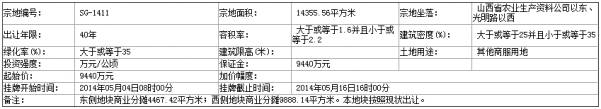 四、本次挂牌出让的详细资料和具体要求,见挂牌出让文件。申请人可于2014年05月04日至2014年05月14日到太原市国土资源交易事务中心(太原市金刚堰路2号太原国土大楼一层)获取挂牌出让文件。