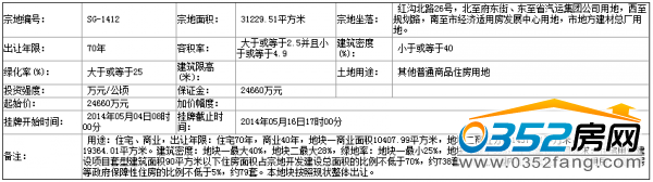 六、本次国有土地使用权挂牌活动在太原市国土资源交易事务中心(太原市金刚堰路2号太原国土大楼一层)进行。各地块挂牌时间分别为:SG-1412号地块:2014年05月04日08时00分至2014年05月16日17时00分;