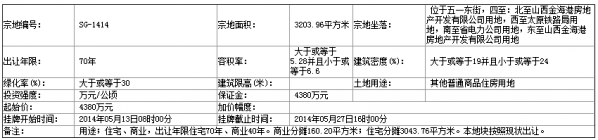 六、本次国有土地使用权挂牌活动 在 太原市国土资源交易事务中心(太原市金刚堰路2号太原国土大楼一层) 进行。各地块挂牌时间分别为:SG-1414 号地块:2014年05月13日08时00分 至 2014年05月27日16时00分 ;