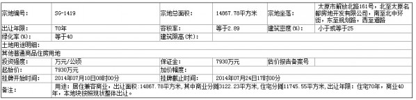 六、本次国有土地使用权挂牌活动 在 太原市国土资源交易事务中心(太原市金刚堰路2号太原国土大楼一层) 进行。各地块挂牌时间分别为:
