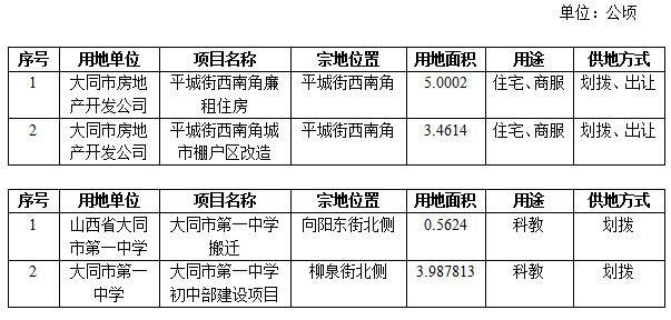 根据《中华人民共和国土地管理法》和国地资源部有关政策之规定,以下宗地已经由大同市人民政府批准,市国土资源局实施供应。现将供应结果公示如下,接受社会监督。