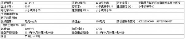 四、本次挂牌出让的详细资料和具体要求,见挂牌出让文件。申请人可于2015年03月31日至2015年04月27日 到天镇县国土资源局获取挂牌出让文件。