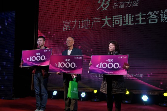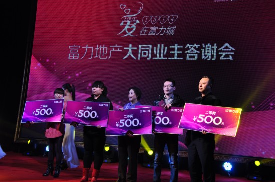 在答谢会现场,由业主抽取15个三等奖,每人300元现金;10个二等奖,每人500元现金;3个一等奖,每人1000元现金;最后,由富力地产王总抽取唯一一个特等奖,特等奖为2000元现金。