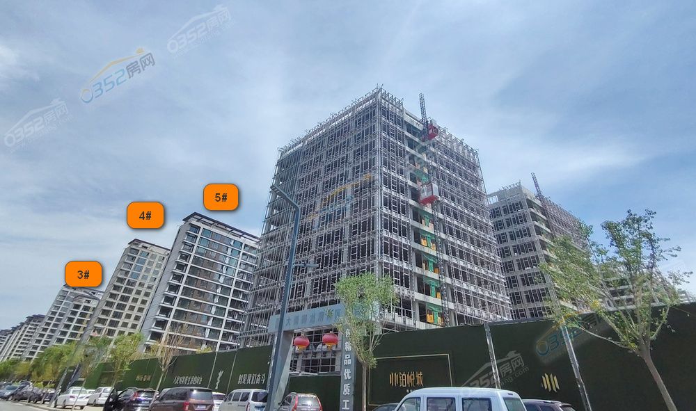 截止到2023年7月,铂悦城各楼栋有序建设,住宅项目进行外立面建设和玻璃安装,园区内景观绿化建设同步进行中,东、西两侧大门已建设完成。
