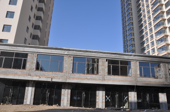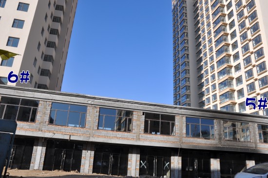 商铺没有安装窗户与玻璃;4#-6#楼之间商铺的窗户、玻璃已安装完毕,仅省外挂石材,整个小区到目前为止路面还未硬化。