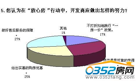 对于购房者来说,房源的质量是关乎其以后数十年使用的“终身大事”,而为购房者把守“质量关”的首先就是开发商。在“您认为在‘放心房’行动中,开发商应做出怎样的努力”的调查中,30%的受访者将选票投给了“提供质量可靠的房源”,其后则为“售后服务的保障”和“给出实惠的购房优惠”,两项占比分别为27%和25%。