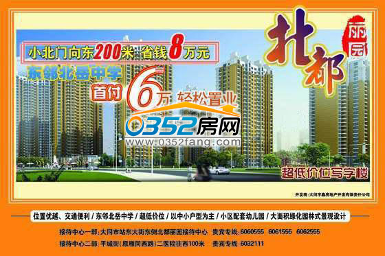 北都丽园位于大同市站东大街,整个社区以中心户型为主,超低的价位并且地理位置优越、交通便捷:25、35、40、4、23、22、30等公交线路直达市区;社区配套设施齐全,特别是教育方面,社区内配套幼儿园一所,周边还有铁一校、城区四十六校、北岳中学、四中、铁一中等名校,让业主轻松解决孩子的就学问题;同时小区内拥有大面积的绿化景观设计,可以使业主一步一景、移步换景的享受环保生态的居住环境。 北都丽园首付6万元即可轻松实现您安居置业之梦!