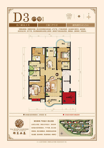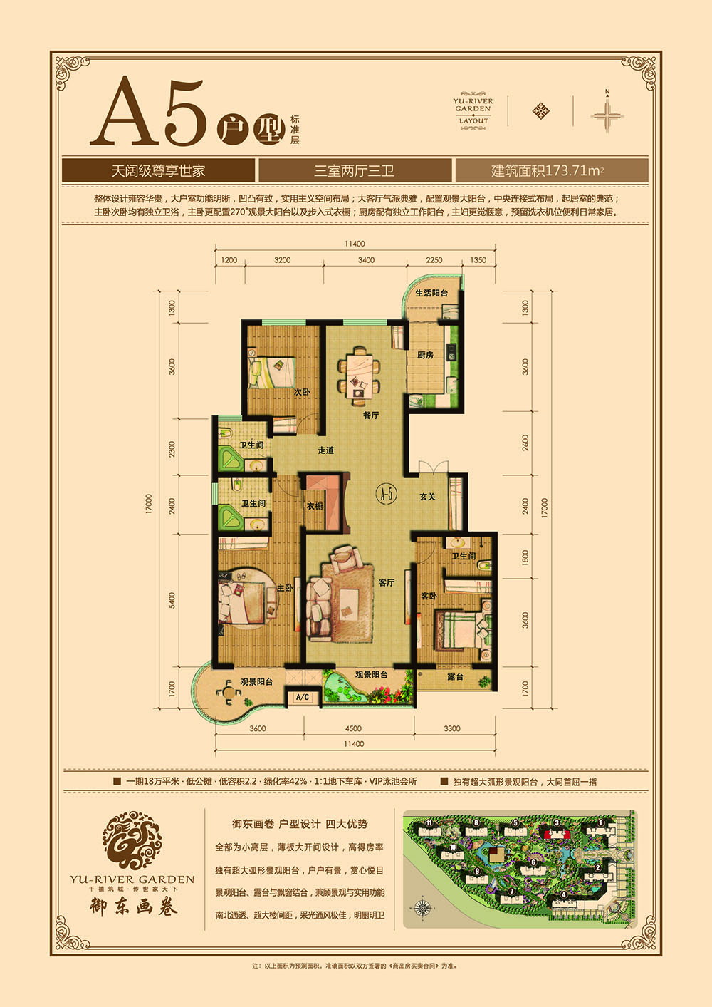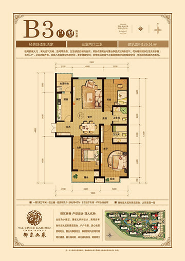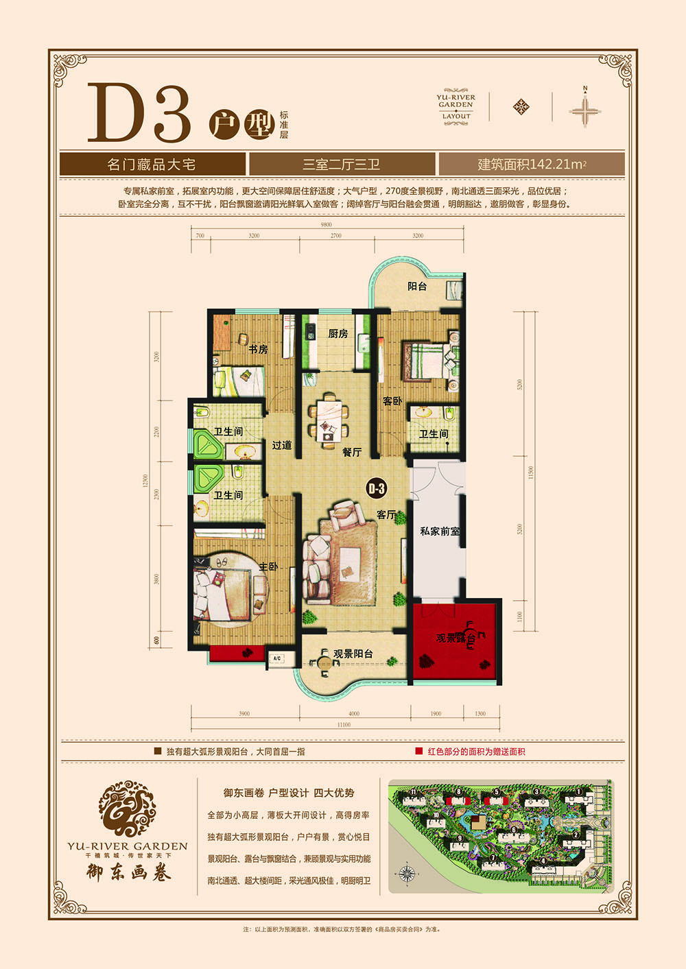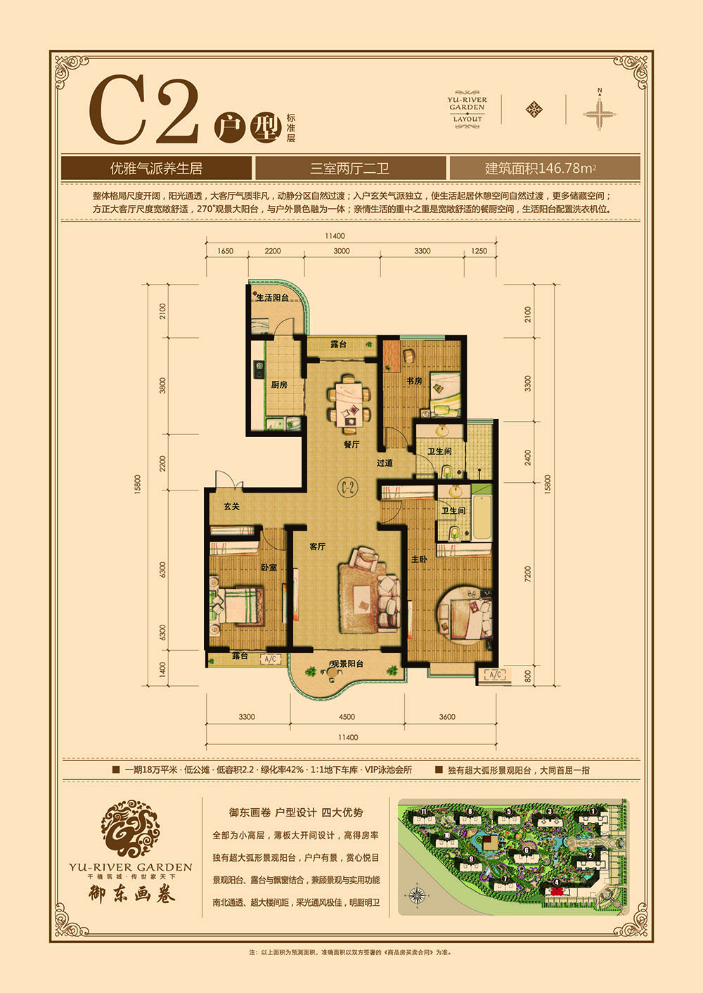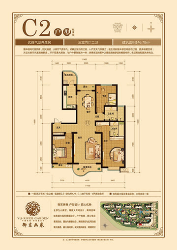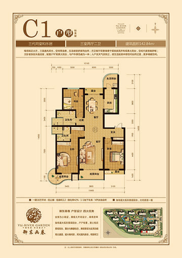 千禧御东画卷C1户型三室两厅两卫142.84平米360全景图