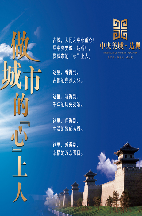 我们的项目,市政府高度关注:“一定要打造一流”。大同人也都在期盼这里的辉煌。所以,众心所向,商街未建已繁荣。取名“未央”,意即“城之南,夜未央,繁华在路上”。具体而言,未央街与南城墙最繁华的一半相对,有众心期盼的百姓基础;有服务城市进步的政策支撑,独特地段,合抱了古城墙、水街、南瓮城广场的旅游人潮,自然而成城南最核心的大商业街区——大气、高端、丰富,堪称大同市的王府井!