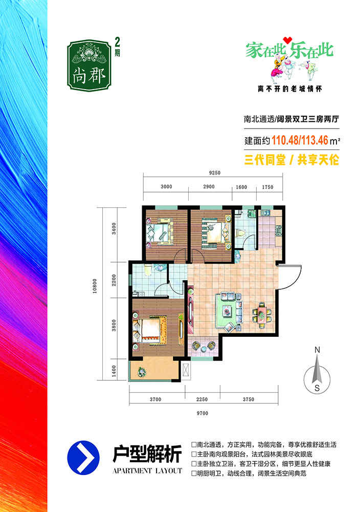 尚郡二期提供两种精致户型,包括建面约77.27与79.2㎡幸福小家,双卧朝南,两室两厅一卫,三口之家,生活其乐融融;建面约110.48与113.46㎡精致三居,南北通透,双卫三室两厅,三代同堂,尽享天伦之乐。尚郡精心挑选两种户型,让您在此幸福生活每一天。