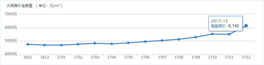 据0352房网数据中心有关大同在售商品房均价走势参考显示,通过对目前大同在售楼盘价格的统计,2017年11月份统计大同楼盘均价为5506元/㎡,12月份统计大同楼盘均价为6142元/㎡。和上个月相比,12月房价出现大幅上涨,每平米上涨636元。