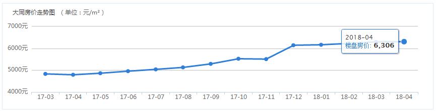 环比2018年3月份,大同4月在售商品房均价每平米上涨9元,环比上涨0.14%。同比来看,2017年4月份大同在售商品房均价为4789元/㎡,2018年4月大同在售商品房均价6306元/㎡,出现大幅上涨,每平米上涨1517元。