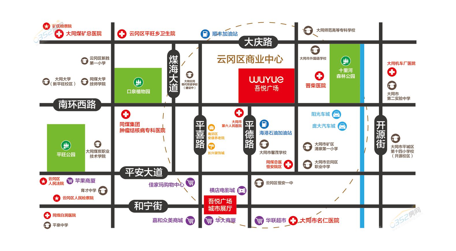 大同吾悦广场有新城控股集团开发,位于云冈经济技术开发区南环西路与平德路交会处,打造约85万方全体验式城市综合体,业态分为大商业、主题商业街及住宅。其中大商业规划业态有星轶影城、多奇妙儿童乐园、永辉超市、海底捞、名抢会等。 [详细]